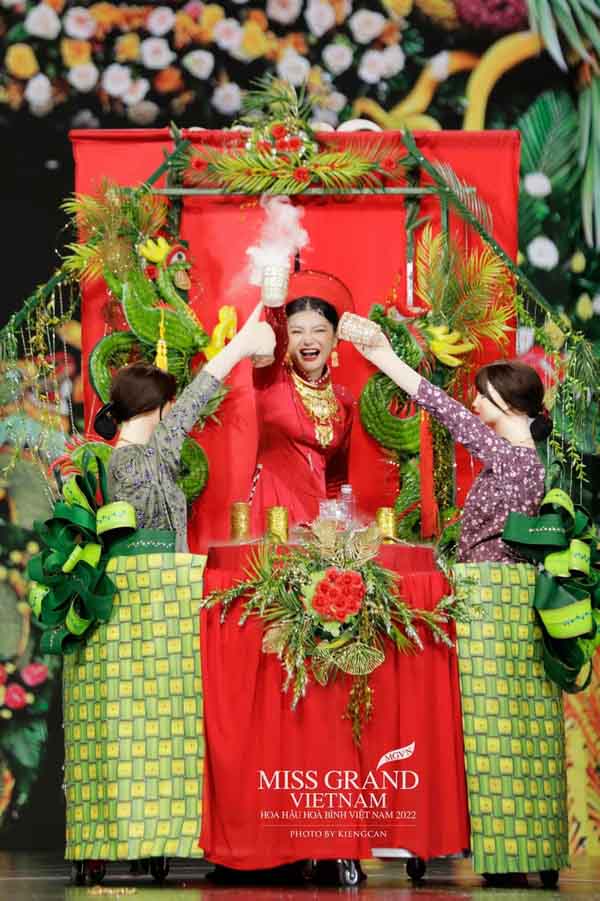 Một thiết kế khiến cả khán phòng bật cười lấy cảm hứng từ đám cưới. Những bộ trang phục công phu, có nhiều chi tiết nhỏ và cũng không kém phần nặng ký, nhưng các thí sinh của Miss Grand Vietnam 2022 đã rất tự tin sải bước trên sàn diễn.