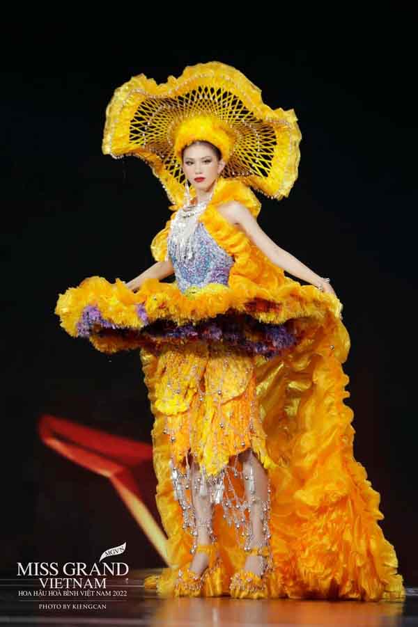 Mẫu thiết kế tiếp theo được lấy cảm hứng từ nghệ thuật múa rối nước, do thí sinh Thanh Trâm thể hiện. Trang phục có biểu tượng thủy đình – sân khấu đặc trưng của loại hình nghệ thuật này. Màu vàng ánh kim giúp bộ cánh xuất hiện nổi bật.