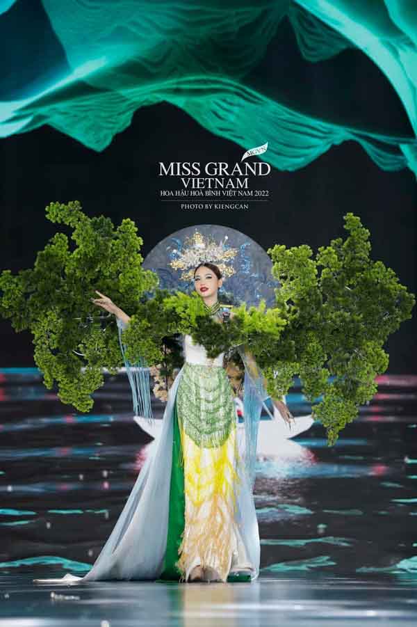 Bộ trang phục “Non xanh nước biếc” không chỉ ngợi ca danh lam thắng cảnh mà thiên nhiên đã ưu ái ban tặng cho Việt Nam mà còn truyền tải ý thức bảo vệ môi trường, kêu gọi sử dụng tài nguyên hợp lý đến cộng đồng, xã hội.