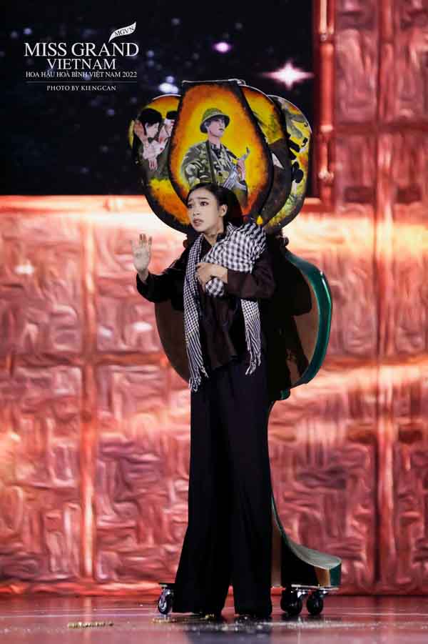 Trang phục mang tên Đèn khuya, do thí sinh Ngọc Thảo trình diễn, khiến nhiều người ấn tượng. Thiết kế này tái hiện hình ảnh người vợ tảo tần, ôm con mòn mỏi đợi chồng nơi chiến trường, nhưng người lính ấy mãi mãi không trở về. Đáng chú ý, diễn xuất nhập tâm của Ngọc Thảo (Ba Lùi) khiến khán giả không khỏi xúc động.