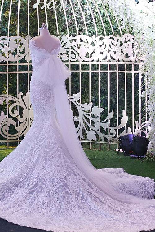 Mẫu thiết kế với kiểu dáng đuôi cá xòe rộng này là một trong hai kiểu váy được Trà My diện trong ngày cưới