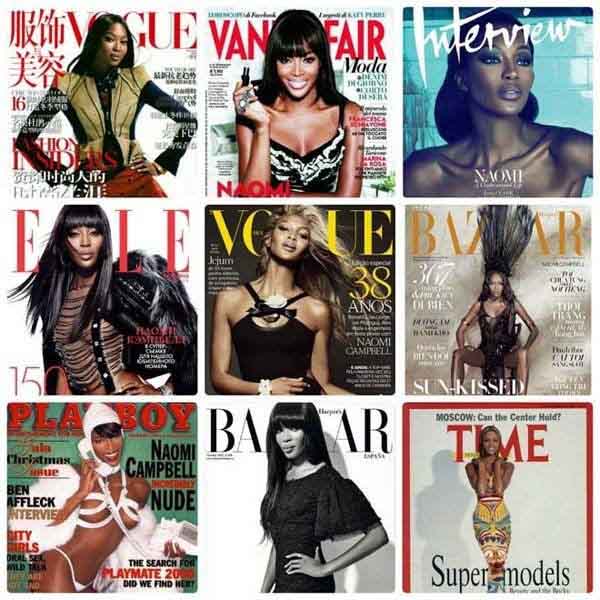 Trong hành trình dai dẳng của sự nghiệp người mẫu, cô từng góp mặt hơn 300 trang bìa của các tạp chí danh tiếng thế giới. Dấu ấn quan trọng trong nghề mẫu của Naomi là xuất hiện trên tạp chí Vogue Anh năm 1987. Tiếp đó, báo đen trở thành người mẫu da màu đầu tiên xuất hiện trên tạp chí Vogue Pháp năm 1988, một tiền lệ chưa từng xảy ra trước đây. Thành công nối tiếp khi cô được bà đầm thép Anna Wintour đưa cô trở thành gương mặt trang bìa tạp chí Vogue Mỹ số September Issue, ấn phẩm đặc biệt và quan trọng nhất của tờ Vogue, lúc đó cô chỉ vừa 19 tuổi.