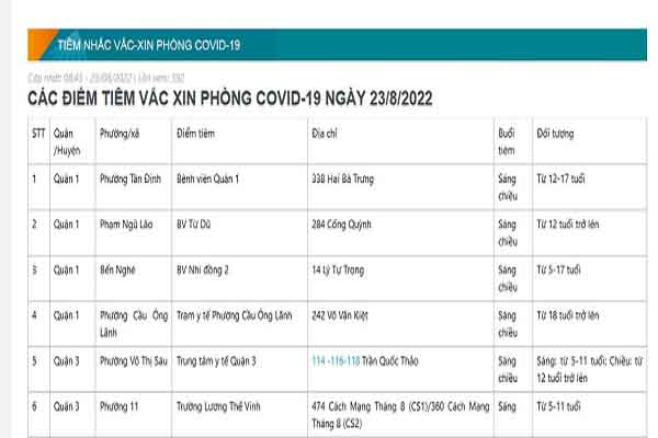 Từ ngày 23/8 – 31/8/2022, TP.HCM tổ chức thêm loại hình tiêm chủng lưu động vắc xin phòng Covid-19 cho trẻ từ 5 đến dưới 18 tuổi nhằm tạo điều kiện cho các trẻ trong độ tuổi này vì nhiều lý do chưa tiêm được như mắc bệnh cấp tính, hoãn tiêm do mắc Covid-19… Đội tiêm tại các điểm tiêm chủng lưu động này sẽ do bệnh viện nhi đồng 1, nhi đồng 2, nhi đồng Thành phố phụ trách. Dự kiến điểm tiêm lưu động sẽ di chuyển đến nhiều trường tại các quận huyện.