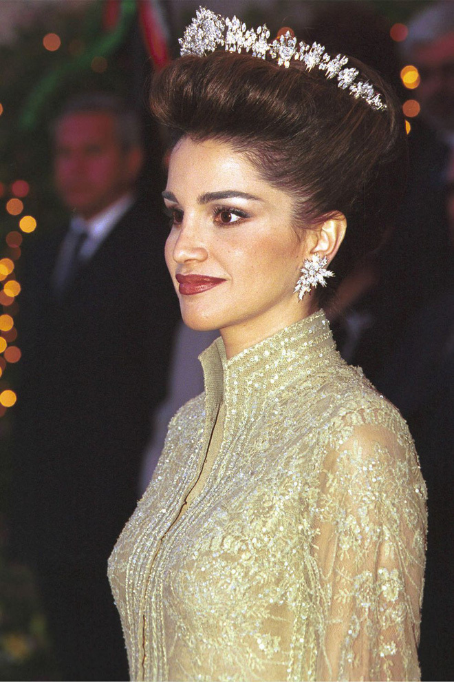 Hoàng hậu Rania của Jordan khoe vẻ đẹp quyền quý với mái tóc búi cao và đánh phồng chân tóc.