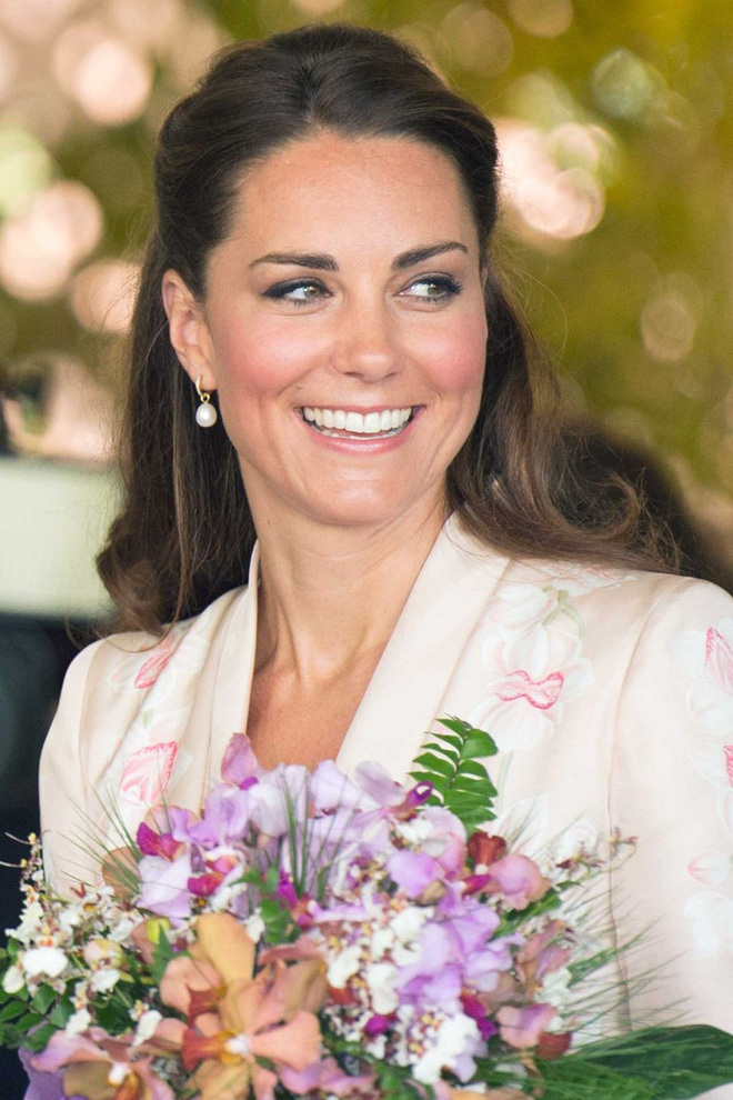 Mái tóc buộc nửa đầu với phần đuôi tóc uốn xoăn nhẹ giúp Công nương Kate Middleton khoe trọn vẹn nhan sắc xinh đẹp