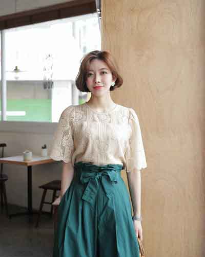 Áo ren màu xanh nhạt cùng chi tiết tay viền bèo sẽ là chiếc áo cực mát mẻ lại thanh lịch dành cho các nàng công sở trong mùa hè này. Chỉ cần kết hợp cùng quần culottes hay quần jeans và thêm đôi sandals cao gót là bạn đã cực kì thu hút rồi.