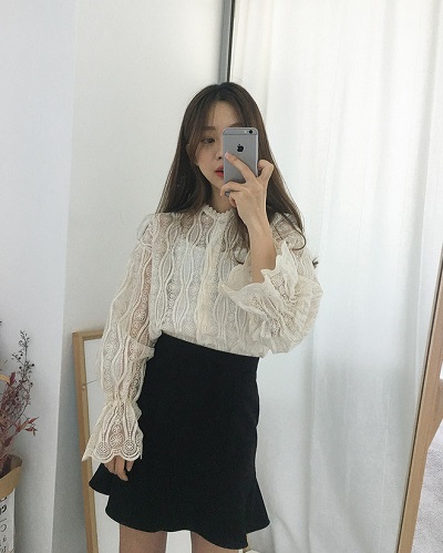 Chiếc áo với chất liệu ren họa tiết cầu kỳ có thể kết hợp cùng chân váy đen cơ bản, nó sẽ tạo nên bộ váy công sở lịch thiệp ngay.