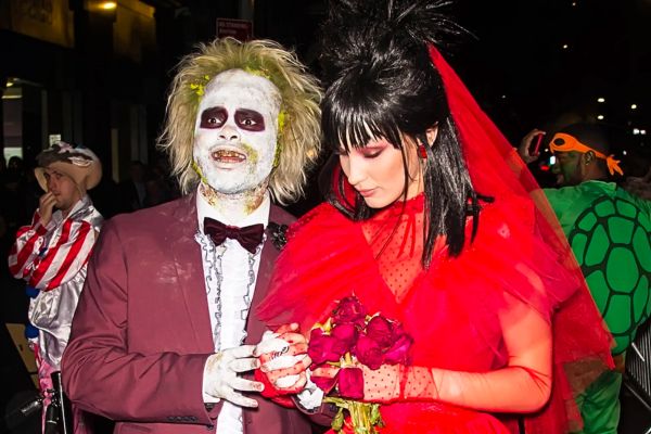 Bộ đôi có màn biến hóa ấn tượng nhất được nhắc đến là Bella Hadid và The Weeknd. Nổi bật giữa sự kiện, cô dâu ma Lydia Deetz (Bella Hadid) với bộ váy cưới xếp tầng xòe đỏ rực cùng lối đánh khối kỹ ở phần gò má, đôi mắt đen ngòm trũng sâu.