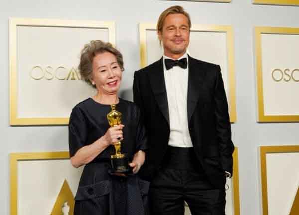 Youn Yuh Jung chụp hình cùng Brad Pitt sau khi nhận tượng vàng. Ảnh: AP