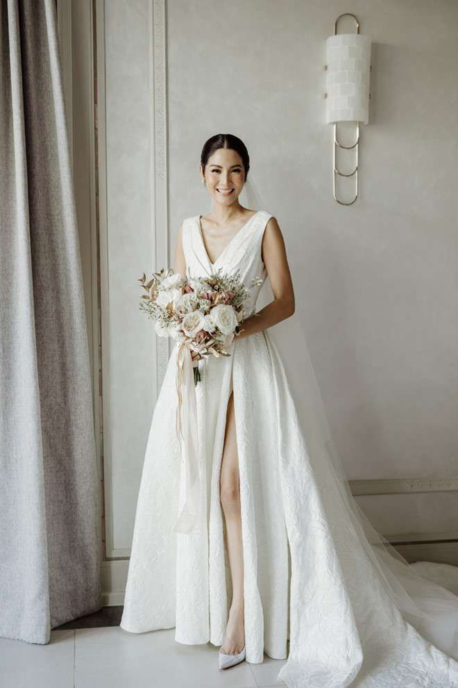 Hôn lễ của Hoa hậu Hoàn vũ Thái Lan 2007 Farung Yuthithum diễn ra tại một bãi biển xinh đẹp. Trong ngày cưới, Farung Yuthithum chọn váy của Đỗ Mạnh Cường. Họa tiết in chìm tạo hiệu ứng thị giác trên bề mặt vải độc đáo.