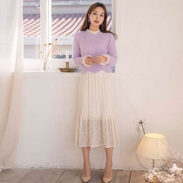 Không thể phủ nhận những sắc màu pastel nhẹ nhàng cực kỳ phù hợp khi sánh đôi với màu trắng tinh khôi. Vẫn là chiếc áo len màu tím pastel, quý cô sẽ trở nên phong cách hơn khi kết hợp chúng với chân váy ren màu trắng dịu dàng, nữ tính.