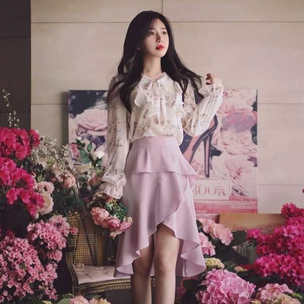 Với chân váy mullet sắc tím pastel, bạn có thể mix cùng với áo sơ mi họa tiết hoa nhí xinh xắn để có được set đồ du xuân cực xinh xắn và đáng yêu.