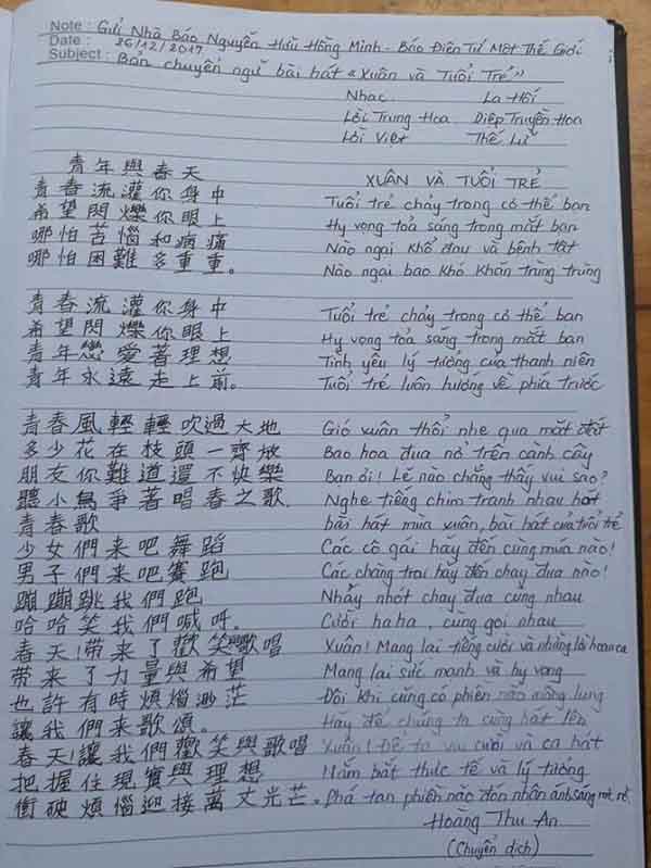 Lời bài Xuân và Tuổi trẻ bằng tiếng Hoa “Thanh niên dữ Xuân thiên” của nhà thơ Diệp Truyền Hoa. (Dịch giả Hoàng Thu An chuyễn ngữ)