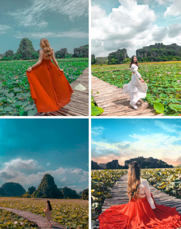 Tranh thủ lúc sen đang vào mùa đẹp nhất rất nhiều chị em đã đến đây mặc những bộ đồ đẹp nhất để chụp ảnh, quay video đăng Facebook, Tiktok, Instagram… Để có những bức ảnh đẹp bạn nên đến đây vào buổi sáng hoặc chiều tà, tránh buổi trưa nắng gắt và hạn chế mặc những trang phục màu hồng và xanh lá giống màu hoa lá sen ưu tiên những gam màu trắng, đỏ, vàng cùng váy dáng dài, xèo to để giúp bạn xinh đẹp và nổi bật trong từng bức hình.