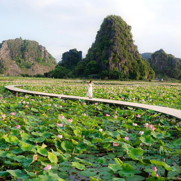 Bạn có thể bắt gặp sen ở khắp mọi nơi nhưng điểm check in đẹp nhất là ở đầm Vân Long dưới chân núi Ngọa Long, Hang Múa với diện tích lên đến 1 hecta. Khi đến đây bạn sẽ cảm thấy như lạc vào chốn thần tiên với một bên là ngọn núi Ngọa Long sừng sững, 1 bên là đồng lúa chín vàng, ở giữa là đầm sen với một lối đi bằng gỗ. Nhìn từ trên cao xuống, cây cầu gỗ mang hình dáng bông sen khổng lồ độc đáo ấn tượng. Giữa khung cảnh thơ mộng trời xanh, nắng vàng, sen hồng, núi non hùng vĩ tạo thành một background chụp ảnh, quay video xịn xò không thể bỏ lỡ.