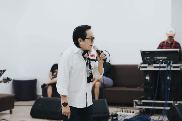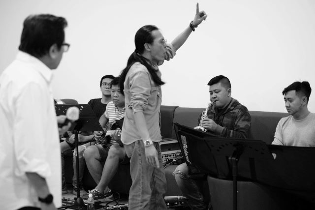 Nhạc sĩ Nguyễn Quang đang chỉ huy dàn nhạc với tiết mục của Danh ca Elvis Phương