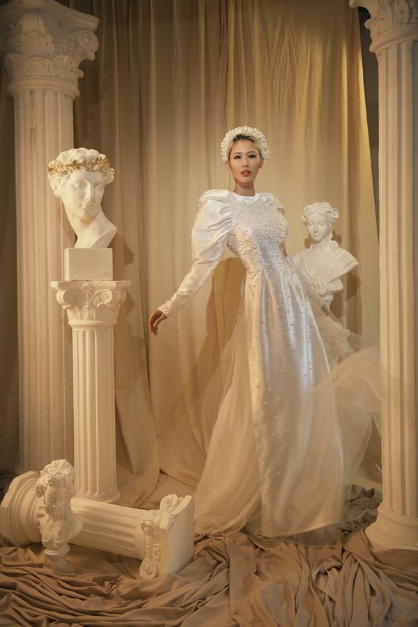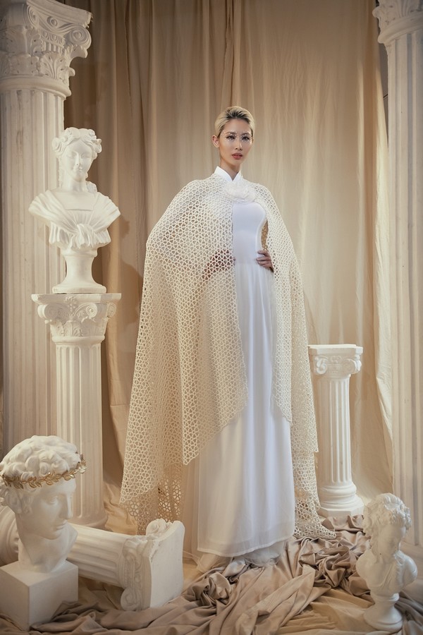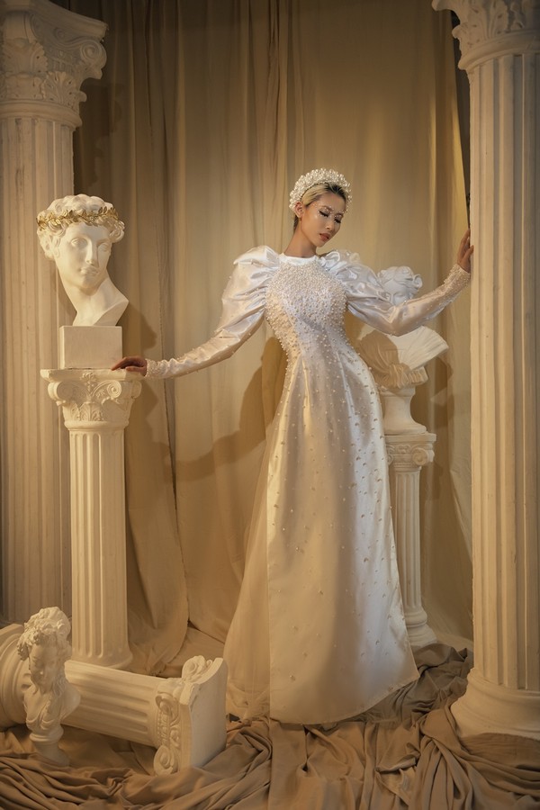 Vẫn là những khuôn dáng quen thuộc của áo dài xưa, tuy nhiên, Minh Châu chứng tỏ khả năng sáng tạo của mình thông qua việc đính kết, làm mới ở phần ở cổ áo, tay áo,… giúp toát lên sự hiện đại, trẻ trung cho người mặc. Trong đó đáng chú ý phải kể đến chi tiết tay phồng, hoạ tiết ren độc đáo được lồng ghép một cách khéo léo, hay phần áo choàng sau cầu kỳ… trở thành điểm nhấn của bộ sưu tập.