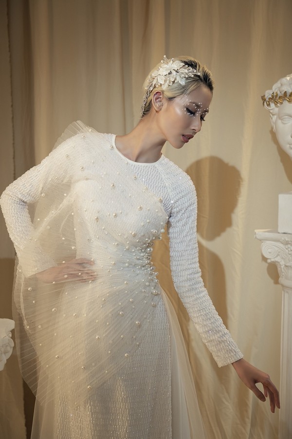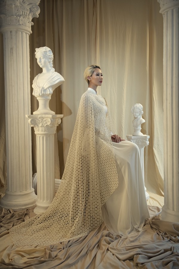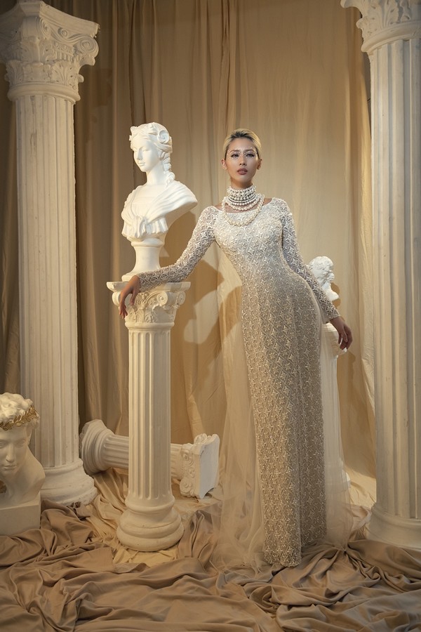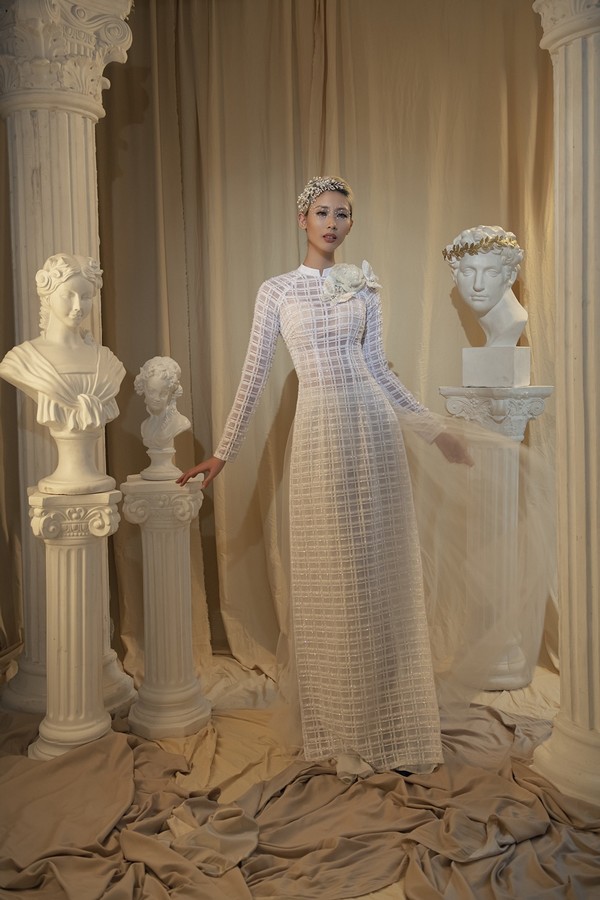 Sở hữu ngoại hình thon thả cùng gương mặt góc cạnh, Hằng Nguyễn toát lên sự quý phái, quyền lực khi diện loạt áo dài được cách điệu, đan xen giữa truyền thống và hiện đại.