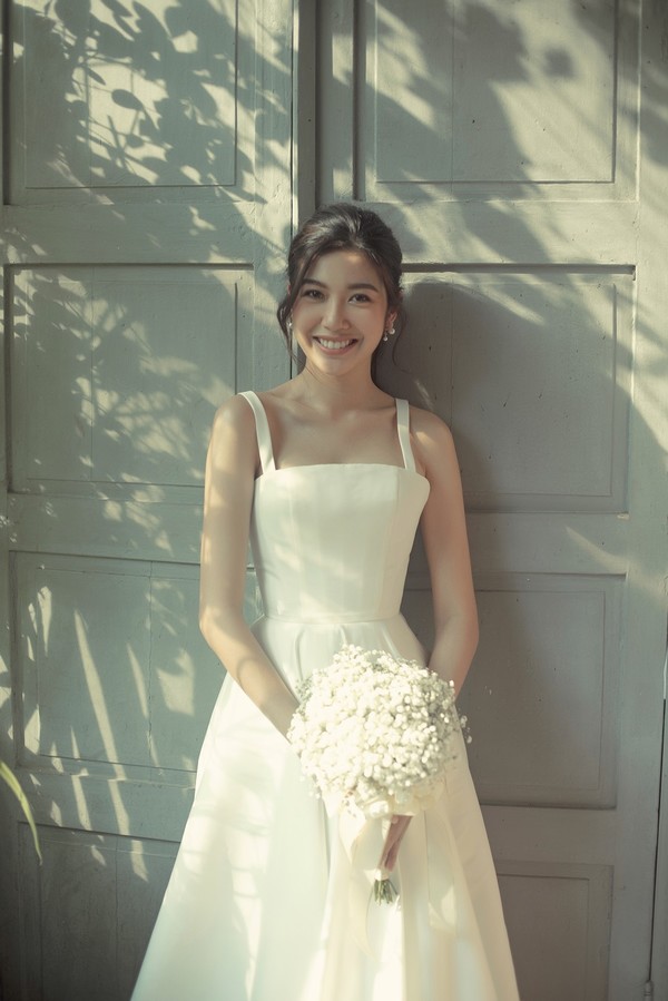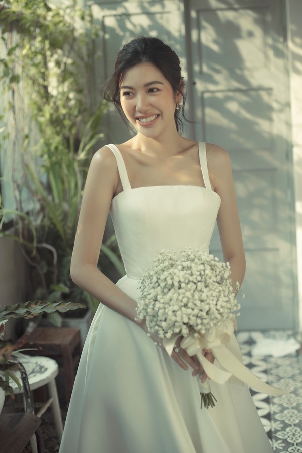 Bộ ảnh được Thúy Vân thực hiện một mình trong không gian mở, không có chú rể bên cạnh. Tuy nhiên, khi kết hợp cùng hoa trắng và khăn voan, người đẹp vẫn nở nụ cười hạnh phúc.