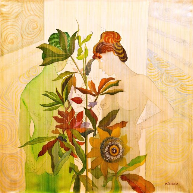 Tiếc nuối những làng nghề dệt lụa có thể đi vào dĩ vãng như Vạn Phúc, họa sĩ Nguyễn Thu Hương lặn lội về làng Quan Phố, huyện Duy Tiên (Hà Nam) để tìm mua lụa Việt. Chị lựa chọn chỉ vẽ trên lụa tơ tằm tự nhiên hoàn toàn.