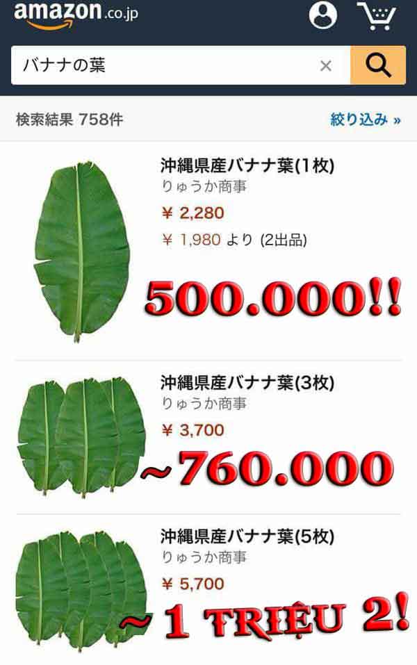 Chuyện này nghe thoáng qua như một trò đùa. Những chiếc lá chuối này có xuất xứ từ tỉnh Onikawa. Giá của một chiếc lá chuối xanh rất tươi được đăng bán với giá 2.280 yên, tương đương với 467521.42 vnd.