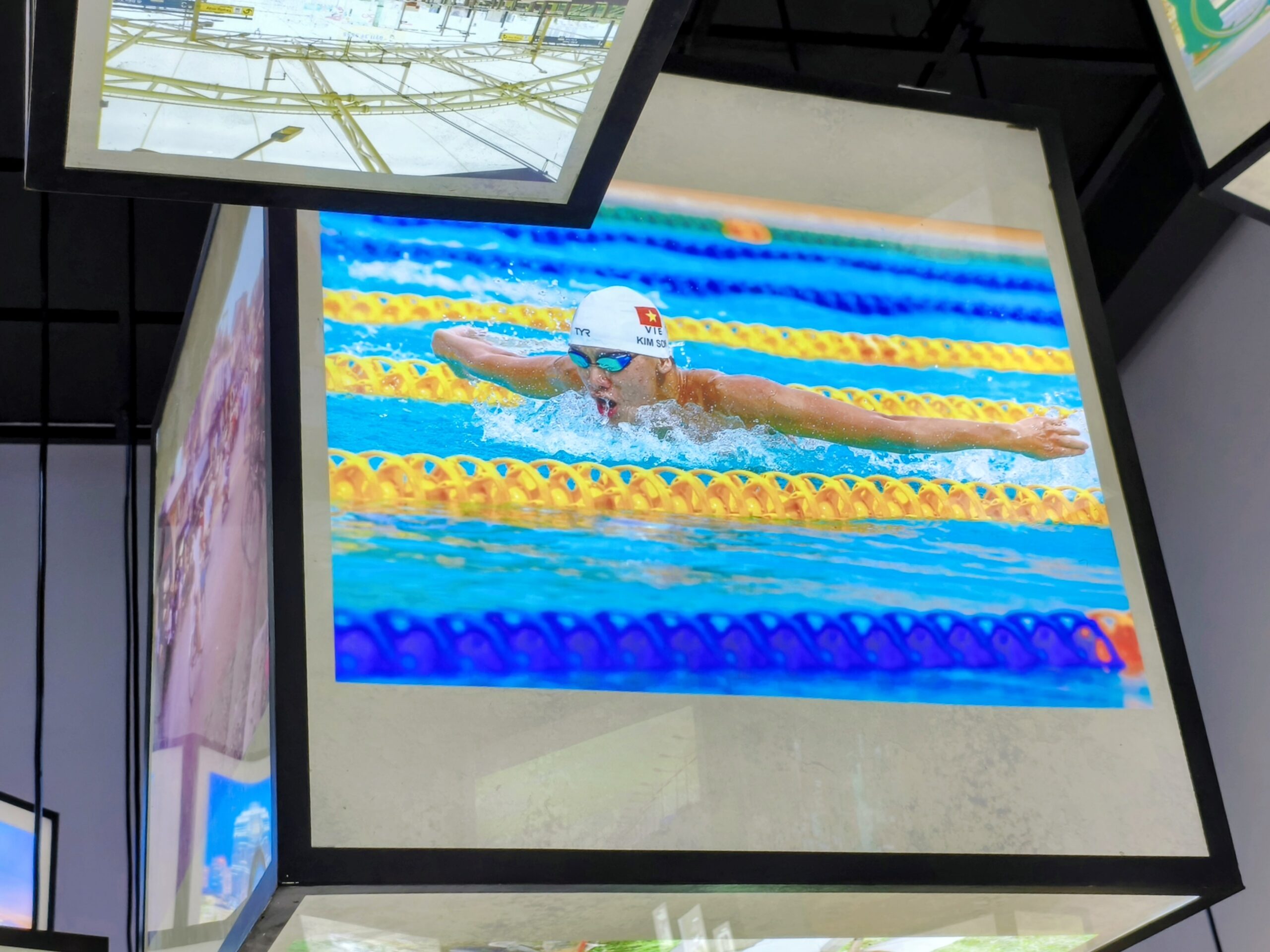 Tại khu vực tầng trệt, Ban Tổ chức đã ứng dụng công nghệ số để truyền tải hình ảnh vào các khối rubik và khối hộp chữ nhật. Những thiết kế độc đáo này khiến nhiều người không thể rời mắt – Ảnh: MXH Duyên Dáng Việt Nam