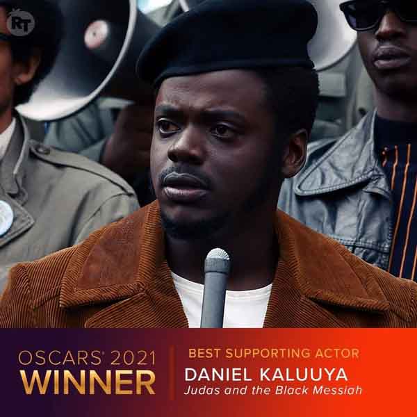 Nam diễn viên phụ xuất sắc cho Daniel Kaluuya, anh chàng diễn viên da màu sinh năm 1989 có bước tiến sự nghiệp nhanh đến chóng mặt trong vài năm gần đây. Bắt đầu tỏa sáng nhờ Get Out (2017) của Jordan Peele, chỉ trong vòng 3 năm tiếp theo, Daniel tiếp tục có những vai diễn đáng nhớ trong Black Panther, Widows, Queen & Slim và năm rồi chốt hạ với vai thủ lĩnh của đảng Báo đen trong Judas & the Black Messiah.