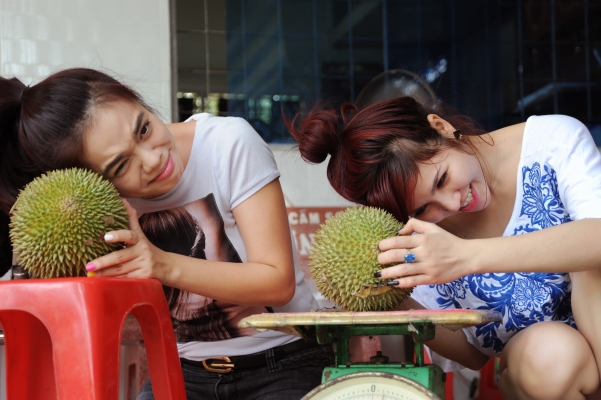 Nếu nhìn sơ tấm hình này mọi người sẽ hết hồn bởi hai cô gái mong manh sao có thể dùng dùng tuyệt chiêu “thiết đầu công” để đập vỡ quả sầu riêng này. Đây là tuyệt chiêu mà ngay cả các võ sư thiếu lâm thứ thiệt cũng phải le lưỡi lắc đầu. Và chân tướng của tấm hình này thật ra chỉ là cách “sống ảo” của các nghệ sĩ nhà ta khi quyết định chụp ảnh đăng facebook cho vui chứ không phải thách đấu như các võ sư thứ thiệt mà chúng ta thường thấy.