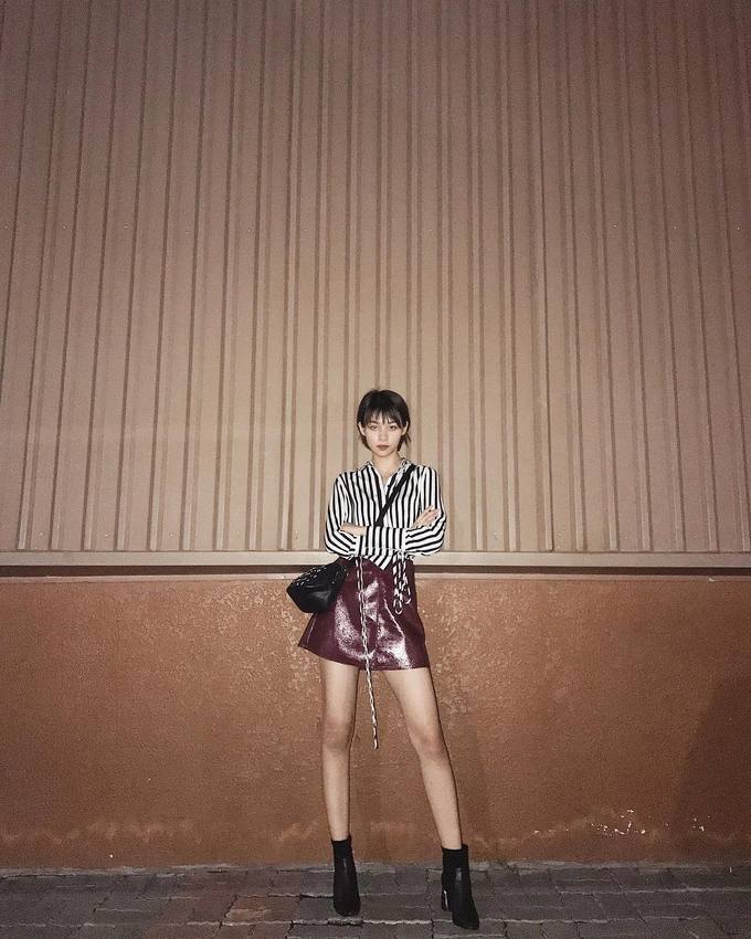 Mix chân váy chữ A với áo sơ mi kẻ sọc nhìn cô nàng trở nên thời thượng và năng động.
