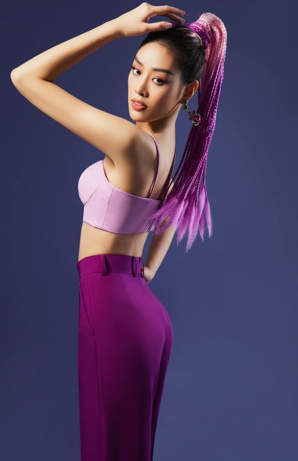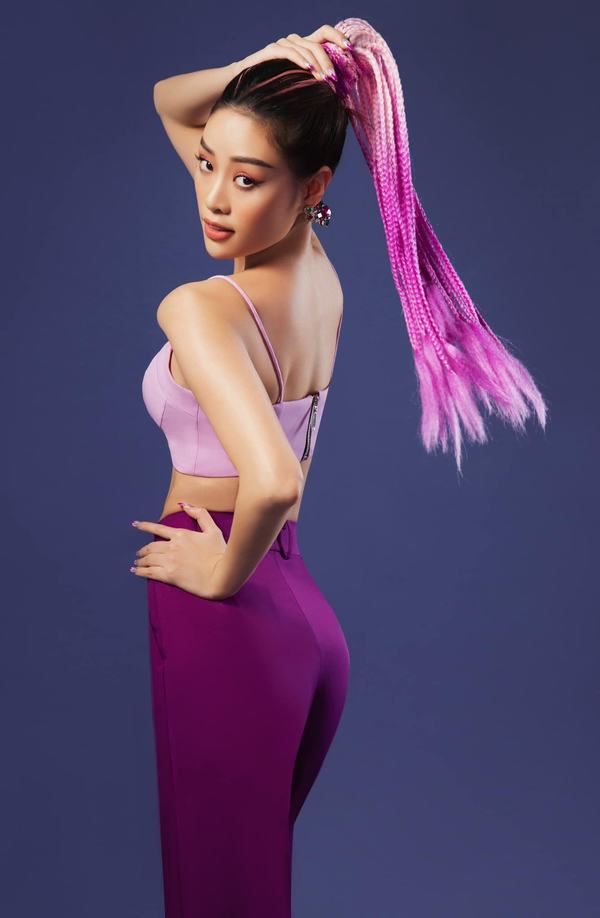 Trên trang cá nhân, Khánh Vân vừa chia sẻ loạt ảnh mới mang màu sắc khác hoàn toàn với phong cách trước đây của nàng Hậu. Bộ trang phục được thiết kế đơn giản với áo crop-top hai dây kết hợp cùng quần culottes cạp cao. Tuy đơn giản nhưng lại rất bắt mắt với tông tím chủ đạo – một trong những màu sắc hot trend được ưa chuộng trong năm qua. Thiết kế đã giúp người đẹp tôn lên “vòng eo con kiến” cùng đôi chân dài. Bên cạnh đó, ấn tượng nhất phải kể đến mái tóc tím dài được tết kiểu bện thừng. Mái tóc độc đáo đã góp phần tạo nên một Khánh Vân vô cùng cá tính.