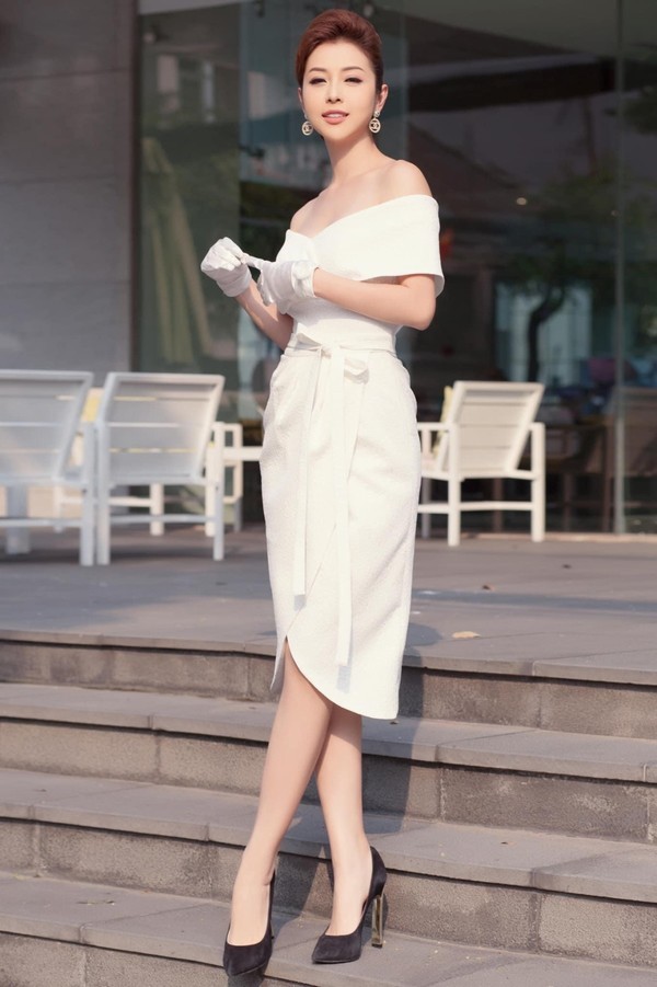 Hoa hậu tạo dáng với đầm đơn sắc trễ vai của Vũ Ngọc và Son, mang găng tay, khuyên tai Chanel và giày cao gót đen.