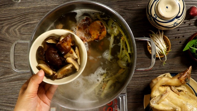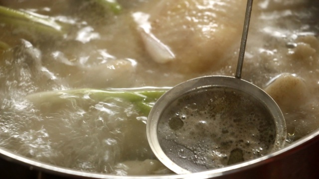 - Xương lợn cho vào nồi đun sôi với nước, sau đó đổ hết phần nước đó đi, rửa sạch lại với nước lạnh. Sau đó đổ xương vào nồi nước luộc gà ninh nhừ (khoảng 2 – 3 tiếng) để làm nước dùng.