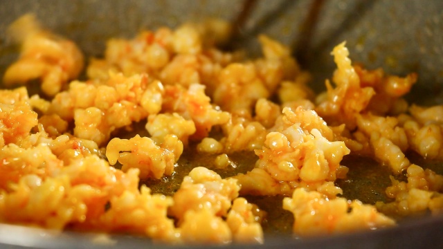 - Rang tôm khô lên cho thơm, để ra đĩa. Tiếp đó, cho chút dầu ăn vào tráng đều mặt chảo, đến khi dầu nóng già thì cho tôm sú đã giã vào, thêm chút nước mắm rồi rang cho tôm chín, hơi khô lại thành ruốc tôm thì cho ra đĩa.