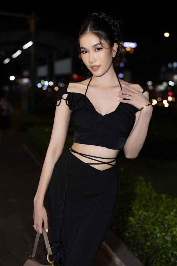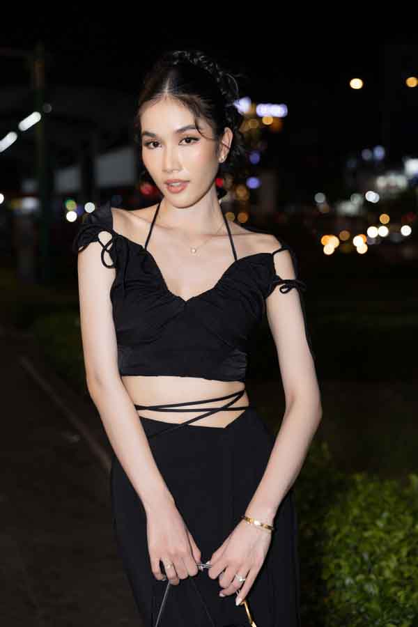 Diện trên mình chiếc đầm đen cá tính, với điểm nhấn hở eo và thắt dây, giúp nàng hậu tôn lên vòng 2 thon gọn của mình. Cùng với đó là phần tóc được búi cao, tôn lên nét thanh tao và không kém phần cá tính của mỹ nhân.