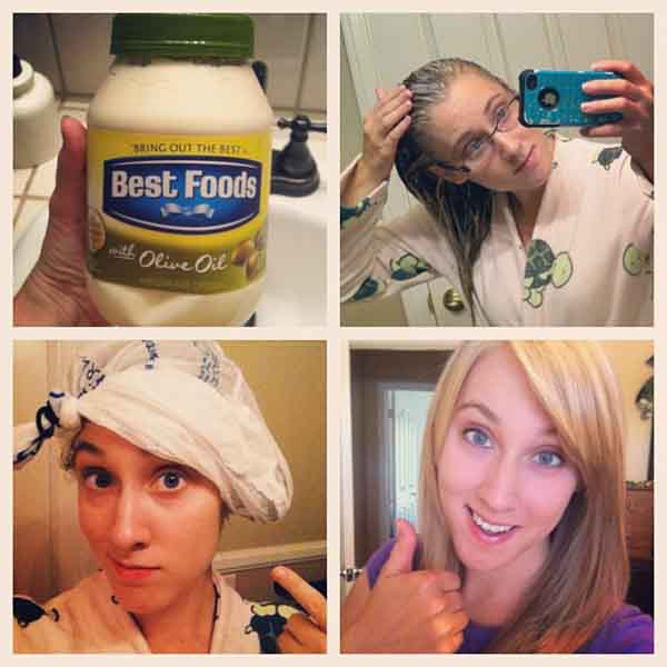 Mayonnaise có nhiều axit amin, rất tốt cho việc phục hồi tóc bị hư tổn. Bạn chỉ cần làm ướt tóc, thoa mayonnaise lên phần ngọn tóc rồi ủ lại bằng khăn hoặc mũ. Sử dụng nhiệt từ máy sấy hoặc máy ủ tóc sẽ làm tăng hiệu quả. Sau 15 phút thì gội sạch lại.