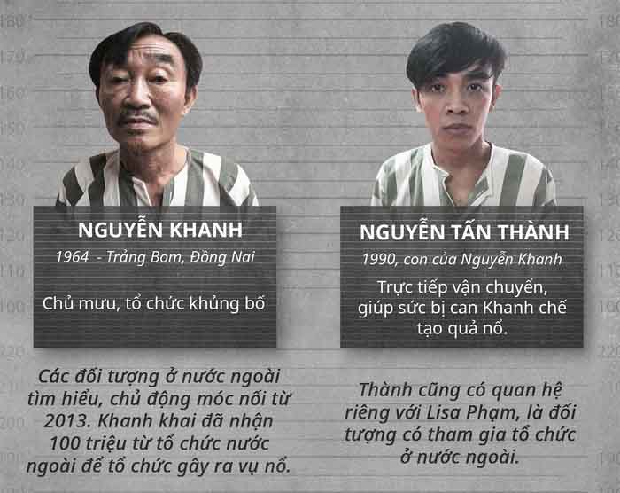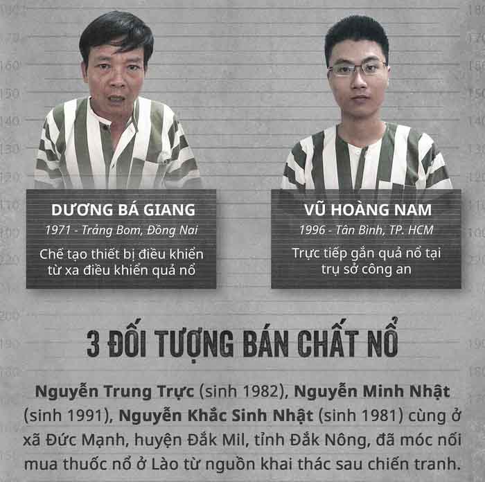 Sau khi bị bắt, Thành khai người cùng chế tạo chất nổ là cha mình, ông Nguyễn Khanh. Và từ đây những người liên quan đã dần lộ diện. Trong đó, hai nghi phạm trực tiếp gây ra vụ nổ tại trụ sở công an phường là Hậu “cướp” và Vũ Hoàng Nam. Riêng Hậu “cướp” rất nguy hiểm khi còn đang giữ một trái bom tự chế.