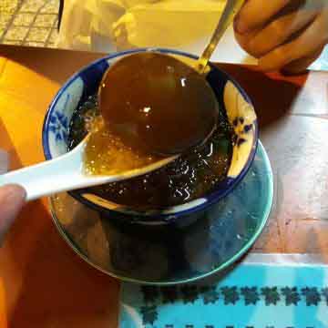 Nếu có dịp ghé quán chè nhà Đèn, hãy ăn thử chén chè trứng trà nhé! Bạn sẽ cảm nhận được vị ngọt thanh, nhân trứng còn hơi nóng ấm ăn cùng nước dùng là trà lạnh rất ngon. Quả trứng mặn mặn ngọt ngọt và lòng đỏ béo thơm. Chè mà dùng trứng gà nghe qua thấy lạ lùng nhưng quả thật ăn cùng nước trà rất hợp vị đấy. Cả món Phục Linh mật ong cũng cực kì ngon nhé. Miếng Phục Linh dẻo dẻo ăn cùng với nước mật ong vị ngọt thanh rất dễ chịu. Ngoài ra, còn có món đu đủ hầm với nấm tuyết và Táo tàu cũng là món ngon “gây nghiện” của những khách hàng quen.