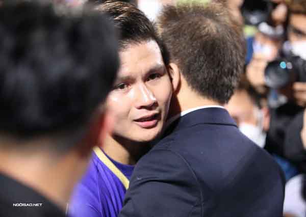 Quang Hải rơm rớm nước mắt khi ôm tạm biệt bầu Hiển. Đây là trận đấu thứ ba liên tiếp ông chủ của CLB Hà Nội tới sân và gặp riêng anh.