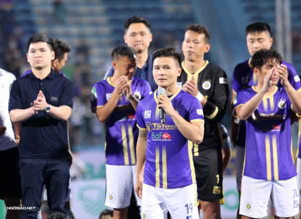 Tiền vệ Nguyễn Quang Hải xúc động chia tay với các đồng đội và người hâm mộ trong trận đấu cuối cùng trên sân Hàng Đẫy, tối 7/4.