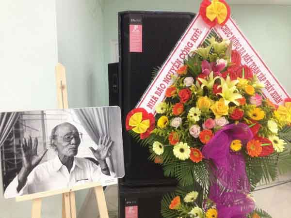 Ra mắt bộ sách Toàn tập Nguyễn Văn Xuân tại Đà Nẵng. Nhà báo Nguyễn Công Khế gửi lẳng hoa chúc mừng hội thảo. (Ảnh: Đông Dương)