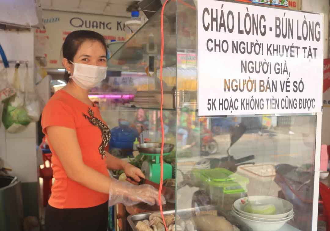 Ai đi ngang hoặc ghé vào quán cháo lòng Quang Khải số 317 đường Trung Mỹ Tây 13 Quận 12 đều sẽ thấy tấm bảng thông báo với dòng chữ: “Cháo lòng, bún lòng cho người khuyết tật, người già, người bán vé số. 5K hoặc không tiền cũng được”. Hằng ngày, cứ 9h30 sáng, trong không gian gần 40 mét vuông với những chiếc bàn ghế được xếp ngay ngắn, tấp nập thực khách đang ngồi trải đều thưởng thức món cáo lòng đậm đà tình thương.
