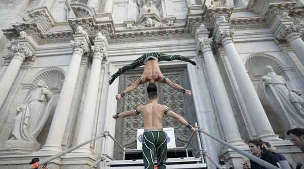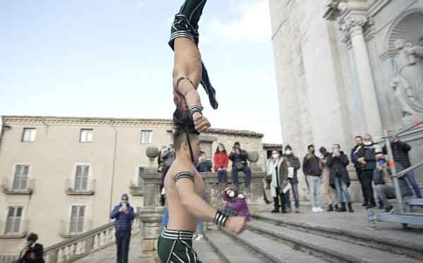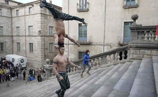 Anh em nghệ sĩ xiếc đã phá kỷ lục thế giới của chính mình khi chồng đầu đi trên 100 bậc thang nhà thờ Girona ở Tây Ban Nha.
