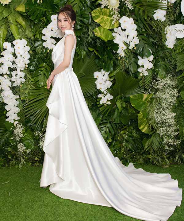 Thiết kế dạ hội với phần ngực khoét sâu, hỗ trợ Quỳnh Nga khoe vòng 1 gợi cảm, phần váy xẻ sâu bên hông giúp cô khéo léo khoe chân thon quyến rũ.