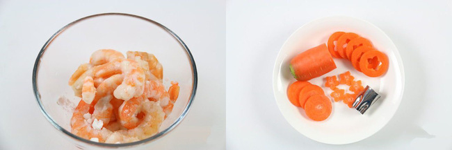 Tôm rửa sạch để ráo nước rồi cho vào bát, thêm muối, rượu nấu ăn và một chút bột mì vào trộn đều, ướp tôm khoảng 5 phút. Trong lúc ướp tôm thì gọt vỏ cà rốt rồi tỉa hoa.