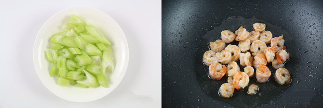 Rau cần tây thái lát, tỏi bóc vỏ rồi đập dập. Đun nóng một ít dầu ăn trong chảo, cho tỏi đập dập vào xào thơm sau đó đổ tôm vào xào săn lại rồi trút ra bát.