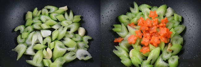 Làm nóng chút dầu ăn trong chảo, cho cần tây vào xào khoảng 2 phút sau đó đổ cà rốt vào xào chung khoảng 1 phút.