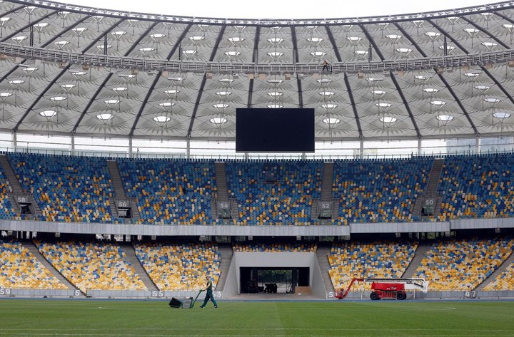 Nhân viên chăm sóc mặt cỏ Sân vận động Olimpiyskiy (Ảnh: AFP).