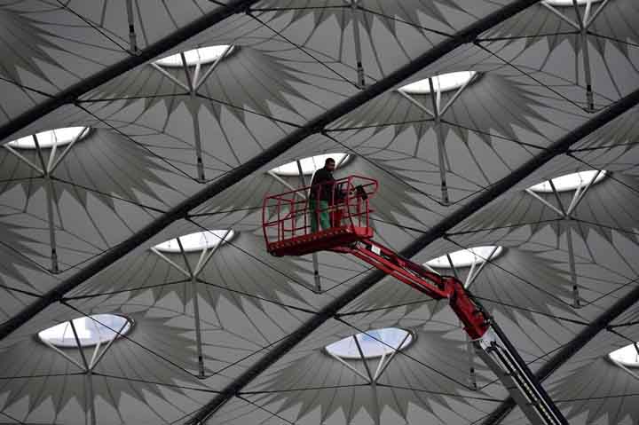 Một công nhân đứng trên một chiếc máy tời bên trong Sân vận động Olimpiyskiy (Ảnh: AFP).