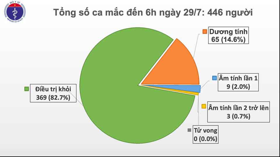 Như vậy, tính đến 6h ngày 29.7: Việt Nam ghi nhận tổng cộng 446 ca mắc COVID-19, trong đó 276 ca nhiễm nhập cảnh được cách ly ngay.