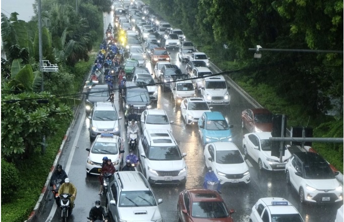 Sáng nay nhiều tuyến phố Hà Nội ùn tắc do mưa to